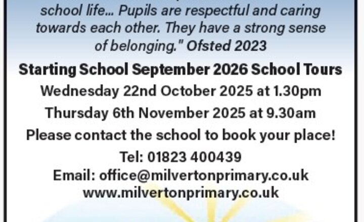 This tour is aimed at parents, so please come along without your child. Please contact the school office to book a place on office@milvertonprimary.co.uk or 01823 400439.